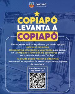 Si eres solidario, comprometido y tienes ganas de aportar para ayudar a personas afectadas por el sismo del 6 de junio, la Ilustre Municipalidad de Copiapó invita a jóvenes y adultos a ser parte de la campaña “Copiapó Levanta a Copiapó, iniciativa que busca generar voluntariados y voluntariadas para apoyar en la limpieza y remoción de escombros de lo hogares más afectados.
