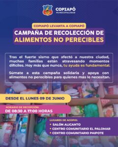 Sumado a la campaña de ayuda en terreno, la Municipalidad de Copiapó levantó la campaña de recolección de alimentos para que la comunidad aporte con alimentos no perecibles en los lugares de acopio a partir de este lunes 9 de junio desde las 08:00 hasta las 17:00 horas. En ese horario vecinos y vecinas podrán dejar alimento para las familias que quedaron más vulnerables por el temblor en el Salón Alicanto y los centros comunitarios de El Palomar y Paipote.